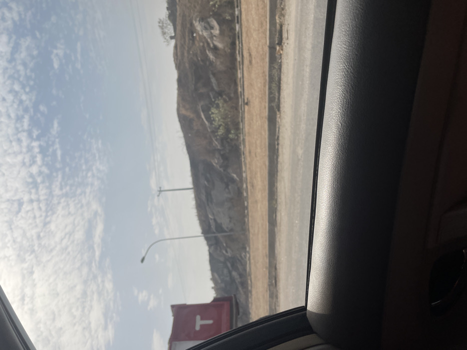 The image presents a roadside view from inside a vehicle, located in Kagini, Nigeria. The bottom half of the frame is occupied by the interior of a car door, featuring a dark gray upper panel, a lighter brown lower section, and a black door handle on the far left. Outside, a multi-lane paved road runs horizontally, separated by a concrete median. Beyond the median lies a strip of dry, light brown vegetation, backed by a rocky embankment. On the far left, a portion of a red truck with a large white "T" logo is visible, positioned adjacent to the road. Rising from the embankment, a tall, slender streetlight pole with a curved luminaire arm is situated to the left of the frame's center. Further to the right, a utility pole with horizontal crossarms and visible wires stands against the sky. The embankment itself is characterized by exposed light-colored rock formations and sparse, dry brown vegetation. A few small green bushes are present lower on the slope, and a solitary tree with sparse foliage is silhouetted on the distant peak of the hill on the far right. The sky above is light blue with scattered white, cirrocumulus clouds, indicating bright daylight conditions with a possible atmospheric haze. No individuals or overt actions are discernible.