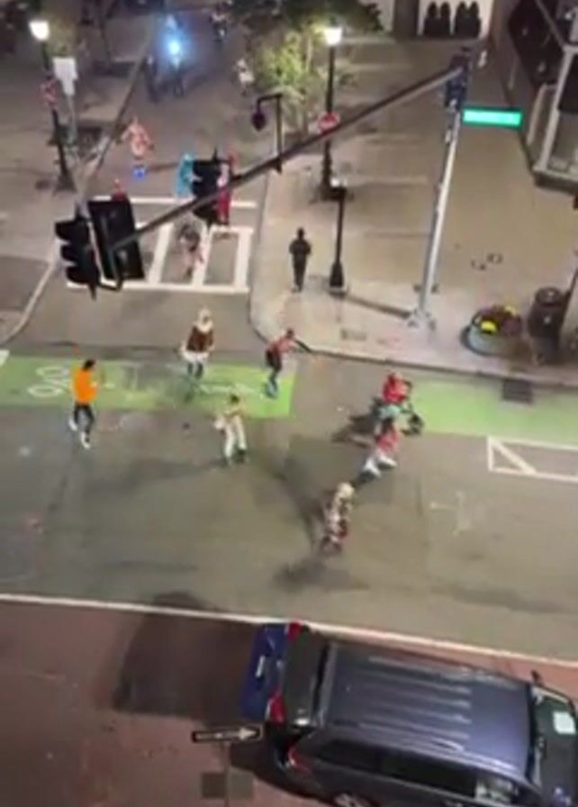 From an elevated vantage point, the video shows a street intersection at night, where a group of people are gathered. Some individuals are walking or running across the street in what seems to be a playful or celebratory manner. A few people are wearing distinctive costumes or outfits. Street lights illuminate the scene, highlighting crosswalks, traffic signals, and a designated bicycle lane. A dark-colored car is parked along the edge of the street, partially visible at the bottom of the frame. The overall environment appears urban, with buildings lining the street and other pedestrians visible in the background.