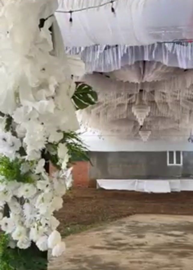 n outdoor event space. The camera is positioned under a tent structure decorated with white fabric. White floral arrangements with greenery decorate the tent supports. The ceiling of the tent is layered with white fabric and fringe, with chandeliers hanging at intervals. Outside the tent, there is a patch of dirt and a grey building with a small window. Children's voices can be heard in the background, and a child runs into the frame briefly in the background.