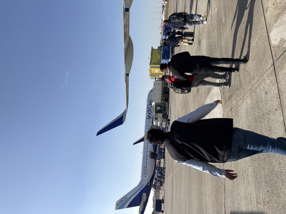 The image depicts an airport tarmac scene under a clear, bright blue sky in Jaipur Municipal Corporation, India