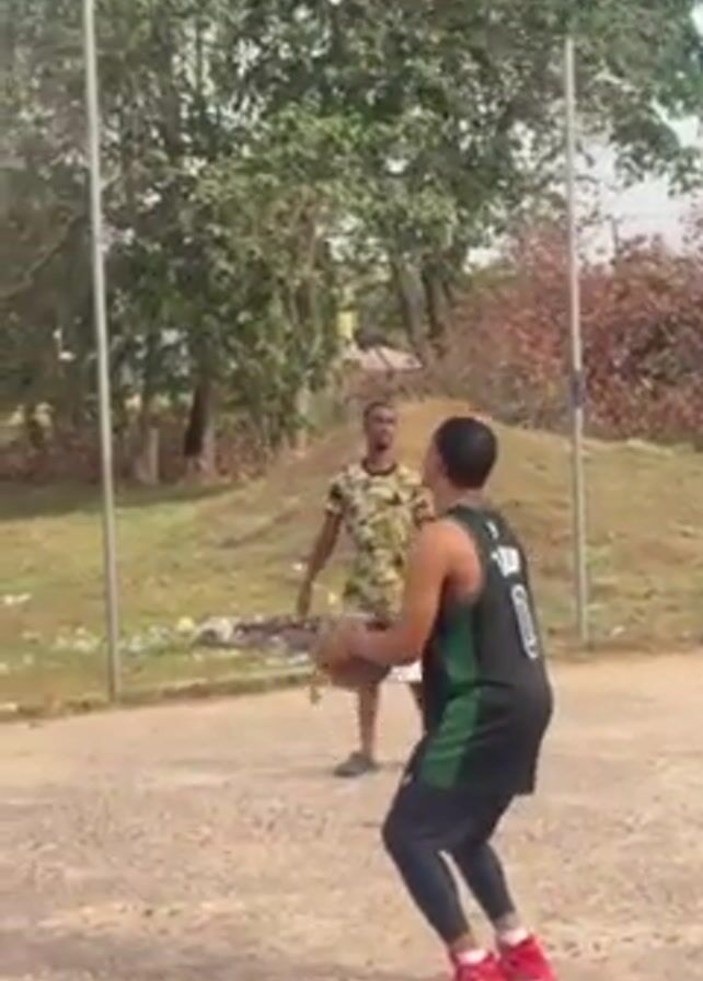 two men playing basketball on an outdoor court. One man, wearing a black and green tank top with the number "0" on it, shoots a basketball towards a weathered and rusty hoop. The ball hits the backboard and bounces out, falling onto the ground. The other man stands nearby, wearing a camouflage shirt and shorts. The court appears to be made of dirt and gravel, and the surrounding environment features trees and grass.