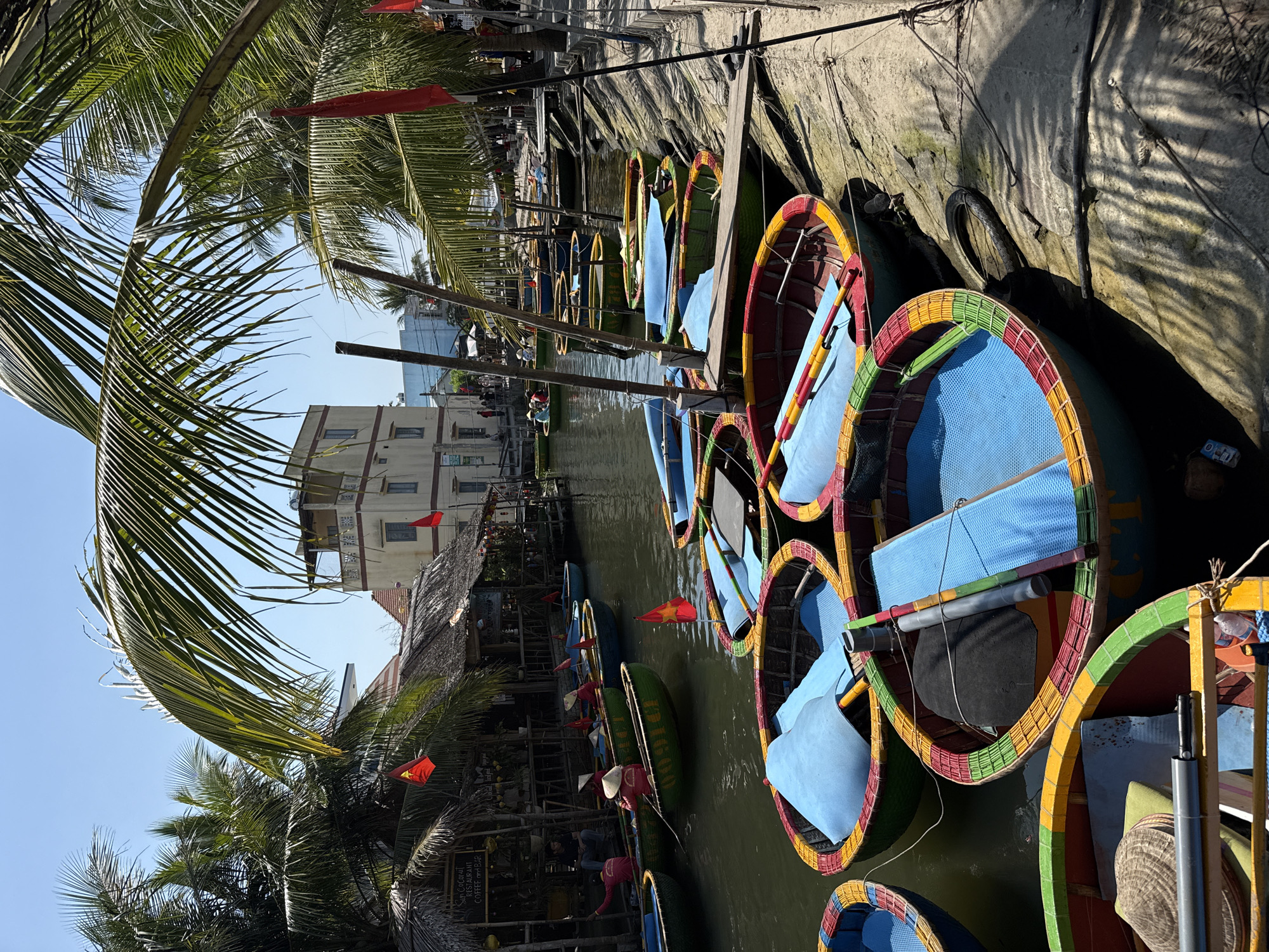 The scene is a canal in Đà Nẵng, Vietnam, lined with round, colorful coracle boats