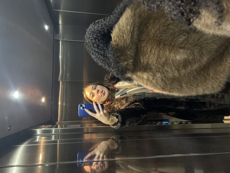 A young woman stands inside an elevator, holding up a blue phone, possibly taking a selfie. She's wearing a fur coat, and part of a patterned scarf is visible. Her tongue is playfully sticking out. The elevator's interior is shiny metal, with light fixtures visible on the ceiling and reflected on the polished surfaces. A control panel with illuminated buttons is also visible, adding to the elevator's interior details.