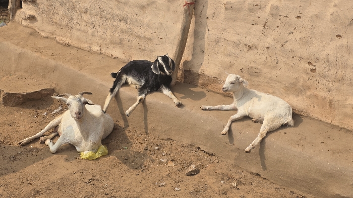 Three goats rest in a dirt area against a weathered wall. A light-colored goat lies on the ground, near a discarded plastic bag. A black and white goat stretches out with its legs splayed, while a smaller, white goat reclines with its legs extended in a similar fashion. The goats cast shadows on the ground, illuminated by sunlight.