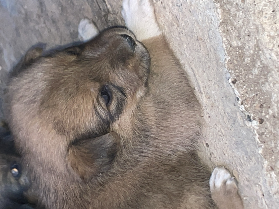 A close-up shows a fluffy puppy lying on a rough, grey concrete surface. The puppy has brown and tan fur, with a small white patch on its paw. Its eyes are partially closed, and it appears to be resting peacefully. Another puppy is partially visible in the bottom left corner. The scene captures a moment of serene repose.