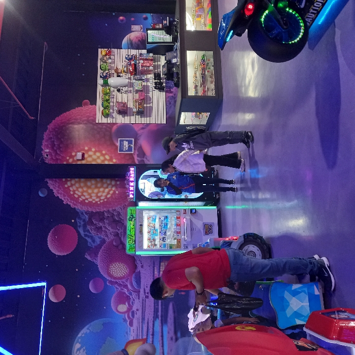 An indoor game center features a wall mural depicting planets and space elements