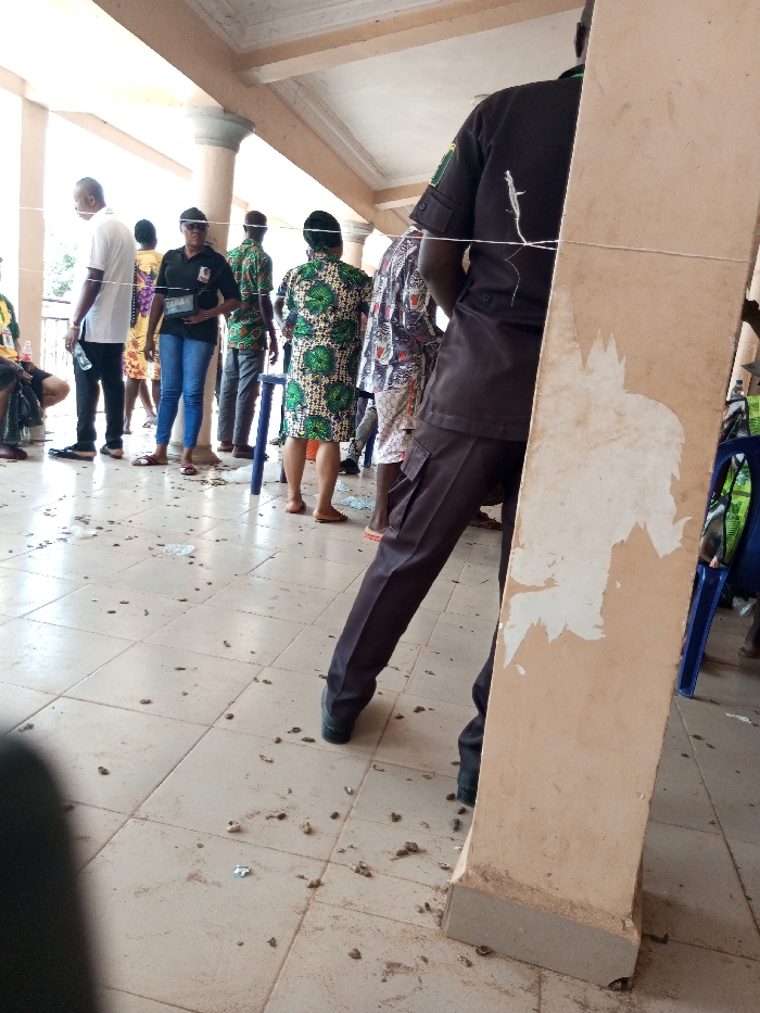 The scene depicts a group of individuals gathered within a covered outdoor area, possibly a veranda or open hall, in Ajalli, Nigeria. The area features a light-colored tiled floor and multiple beige support columns with visible flaking paint or plaster. In the immediate foreground on the right, the lower body and back of a person wearing a dark brown/black short-sleeved uniform shirt and cargo pants are partially obscured by a column. A white string or wire runs horizontally across the upper back of this individual and extends across the scene. In the midground, approximately seven to eight individuals are standing. From left to right: a person in a white short-sleeved shirt and dark pants holds a clear plastic bottle; a woman in a black t-shirt, blue jeans, and a black baseball cap holds a white rectangular object; another person wears a green, yellow, and black patterned dress; other individuals wear various patterned clothing, some partially obscured by columns or other people. A blue plastic stool is visible between some individuals. The tiled floor is notably scattered with numerous small, dark, irregular objects, possibly debris, dirt, or discarded items. Bright ambient light indicates daytime.