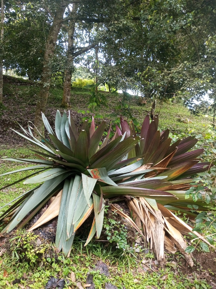 This image depicts a natural outdoor environment on a sloping terrain in Kanand, India. In the foreground, a large, multi-stemmed plant with numerous broad, strap-like leaves is prominently featured. The leaves exhibit a color spectrum from light green to bluish-green, with a distinct reddish-purple hue present on many of the upper and outer leaves. Several dried, light brown leaf remnants are observed at the base of the plant. The midground consists of a grassy incline sparsely covered with smaller green plants and dark brown patches of soil or organic matter. The background reveals a dense wooded area characterized by multiple mature trees with visible trunks and extensive canopies of green foliage. The scene contains no discernible human figures, actions, or manufactured objects. Natural daylight illuminates the entire landscape.