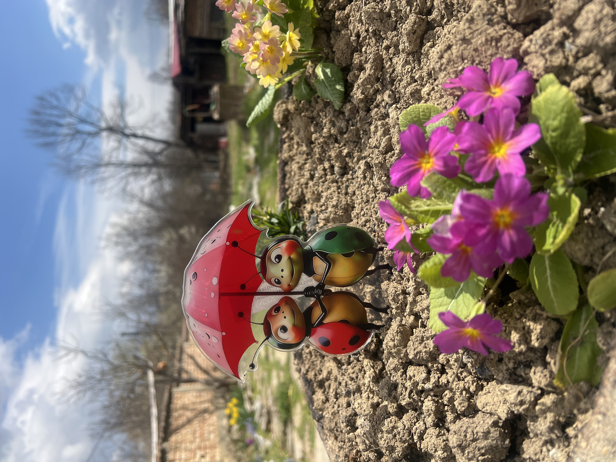 Two decorative ladybug figures are positioned on loose, clumpy brown soil in a garden in Shumata, Bulgaria