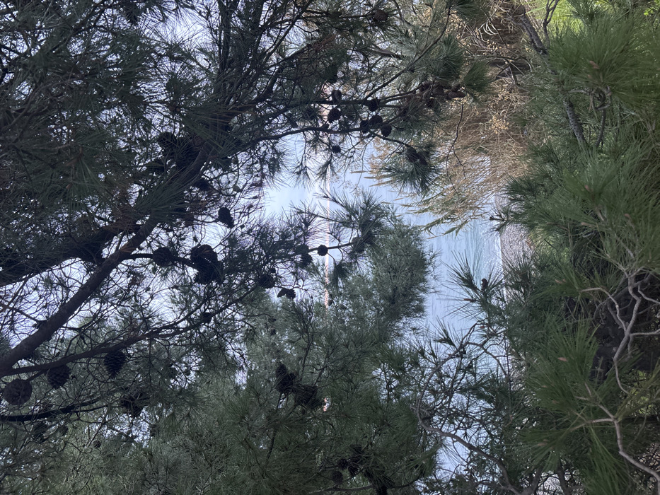 The image presents an outdoor scene in Bar, Montenegro, looking out towards the Adriatic Sea through dense coastal vegetation. The foreground is primarily composed of dark green pine tree branches, thickly covered with sharp needles and numerous mature brown pine cones. These branches form a natural, irregular frame around the central view. Through the openings in the foliage, the light blue-grey surface of the sea is visible in the mid-ground, exhibiting subtle surface ripples. A narrow, light-toned band, consistent with a pebbled or rocky shoreline, is discernible at the water's edge, with a faint, distant landmass or coastal feature visible on the horizon. Clumps of dry, light brown reed-like vegetation are situated on the right side of the frame. The sky above the sea appears a pale, overcast blue. No individuals, animals, or active subjects are present within the frame.