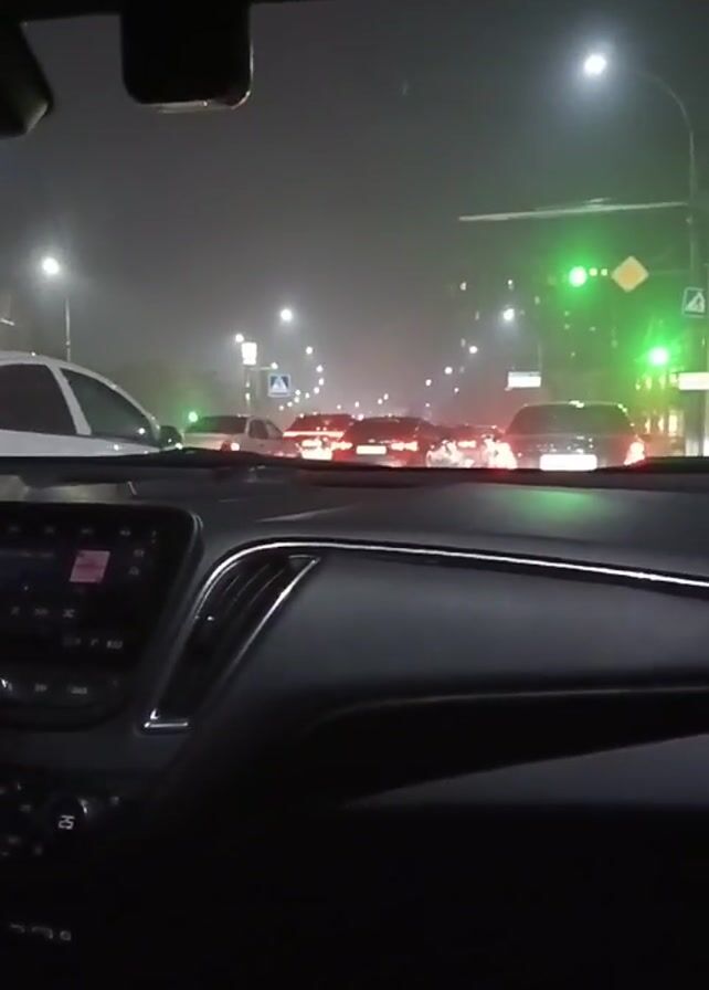 view from inside a car driving through a city at night. Traffic is moderate, with several cars ahead. The traffic lights are green. Streetlights illuminate the scene and add to the ambient light, creating a hazy atmosphere. The car's dashboard is visible, and a dashcam is attached to the windshield.