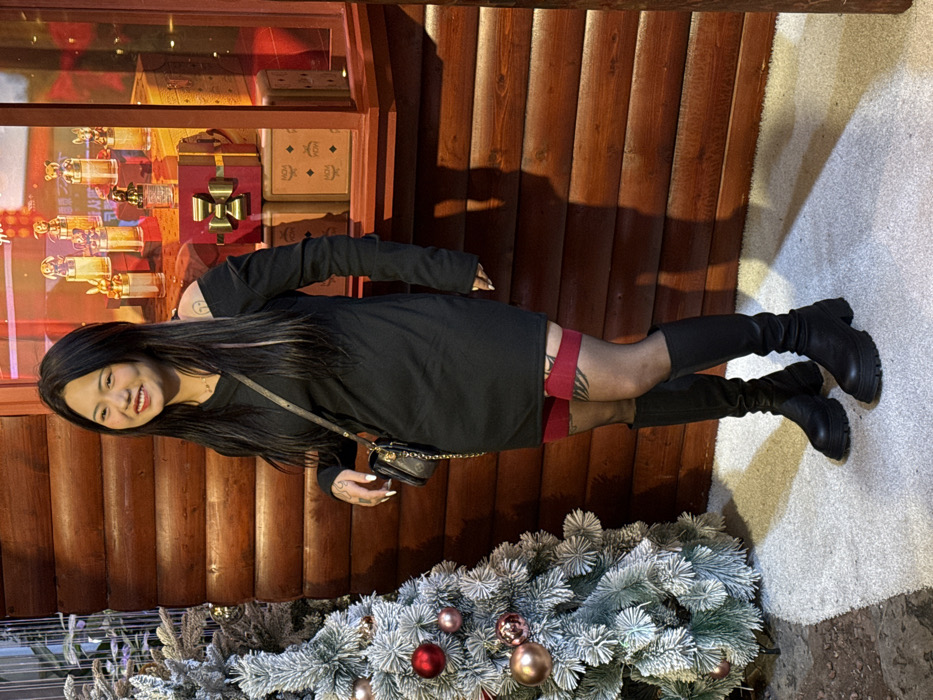 An East Asian female is depicted standing in a festive commercial environment within Liangjiang, China. The subject, with long dark hair, wears a black long-sleeved dress, black sheer stockings, red thigh-high bands, and black knee-high boots with thick, lugged soles. A small dark shoulder bag with a gold-colored chain strap is positioned across her body. Tattoos are visible on her left shoulder/upper arm and her right hand. She is smiling and facing slightly to the viewer's left. To the subject's immediate left stands a frosted artificial Christmas tree adorned with red and rose gold spherical ornaments. The background consists of a wall constructed from horizontal, dark reddish-brown simulated wooden logs or planks. To the subject's right, a display window is set into this wooden wall. Inside the display, multiple perfume bottles are visible, some featuring animal-shaped caps (specifically dog and rabbit figures), along with a red gift box secured with a gold bow, and several stacked boxes bearing the "MCM" logo. The ground directly beneath the subject is covered by a light-colored, textured mat or rug, transitioning to a darker, possibly paved, surface further left. The scene is brightly illuminated.