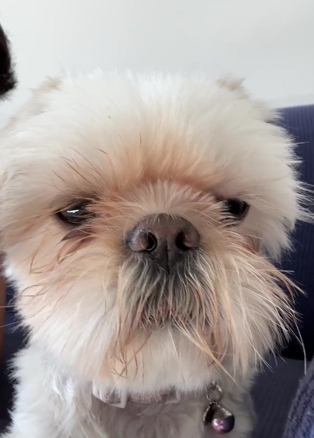 close-up view of a small, white dog, possibly a Shih Tzu mix, with brown eyes and a black nose