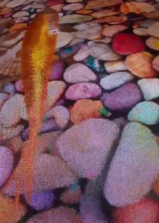 close-up of a textured, flat surface that simulates a bed of colorful river stones underwater. The stones are various colors including white, pink, purple, orange, green, red, and blue. An orange and yellow artificial fish swims through the simulated water, creating a slight ripple effect on the surface. The texture of the surface is visible, giving the appearance of a screen or print rather than real stones and water.