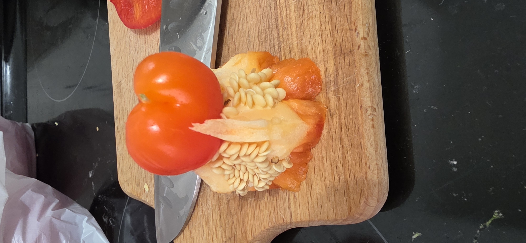A close-up shot shows a cut red bell pepper on a wooden cutting board, alongside a knife and a cluster of red cherry tomatoes. The pepper has been halved, exposing the inner structure, including the seeds. The scene appears to be in a kitchen environment, with a dark countertop partially visible in the background. The lighting suggests an indoor setting, and the focus is sharp on the food items, emphasizing their texture and color.