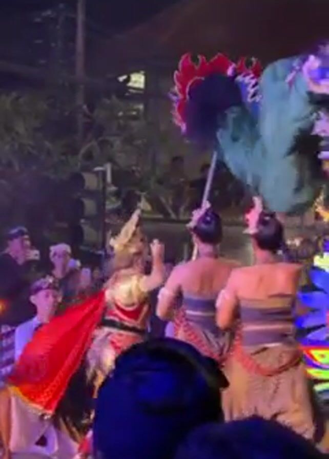 Balinese dance performance at night. Dancers in traditional costumes, some carrying large, colorful props, move in front of a crowd. The scene is lit by stage lights and possibly torches, with buildings visible in the background. The dancers' movements and the accompanying music create a vibrant, cultural atmosphere.