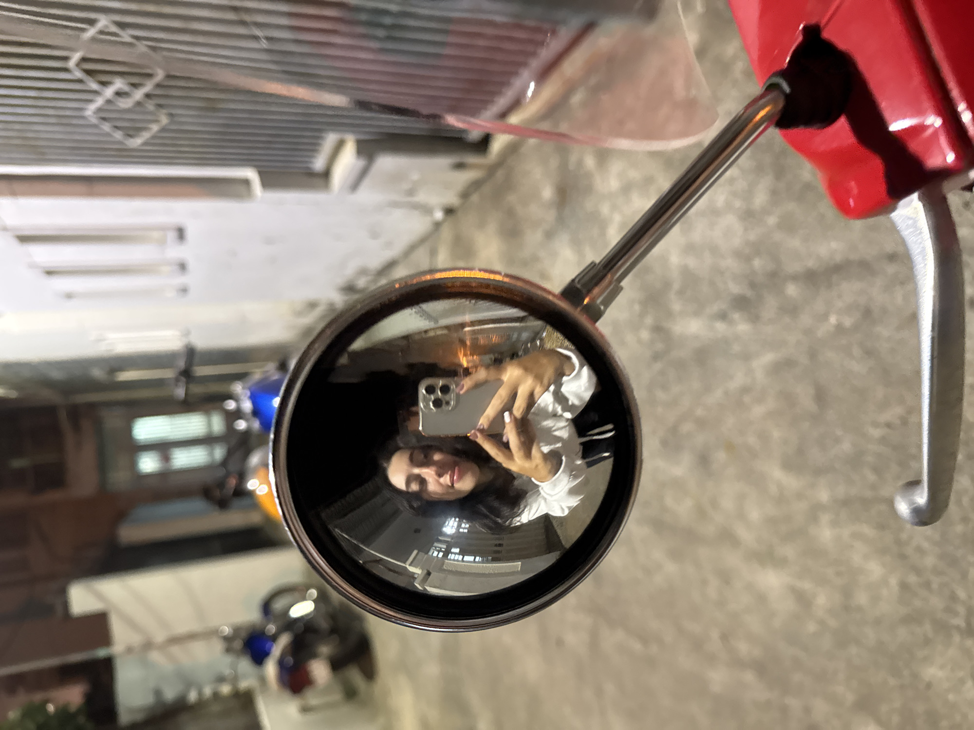 A nighttime urban scene is depicted within a narrow alleyway in Nha Trang, Vietnam. The primary focus is the circular rearview mirror of a red scooter or motorbike, positioned in the foreground to the right. Reflected in this mirror is a young adult female with dark, wavy hair, wearing a white long-sleeved top and dark lower garments. She holds a light-colored smartphone, equipped with a multi-lens camera, with both hands, actively taking a photograph of her reflection. Her expression shows a slight smile. Her fingernails are painted light pink and white. The paved ground beneath the motorbike is visible. In the blurred background, other motorbikes, including blue and orange models, are parked along the alley. Buildings with light-colored facades, some featuring vertical window grilles and a ribbed metal gate, line both sides of the narrow thoroughfare, illuminated by artificial light sources.
