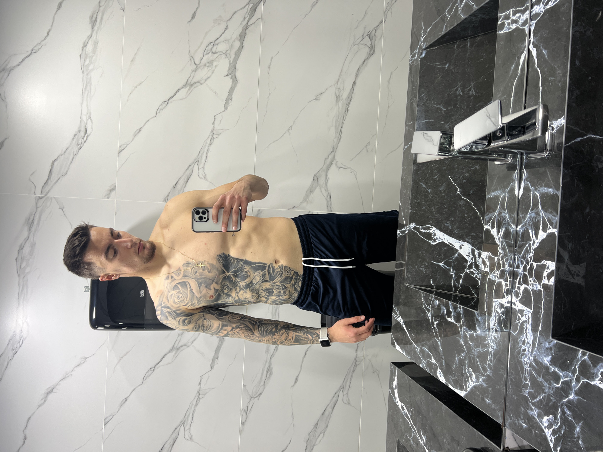 A slender, light-skinned man with tattoos is in a bathroom. He has an arm covered in tattoos. He is wearing black shorts with a white drawstring. He is holding a phone, taking a selfie. He is bare-chested. The bathroom has white marble-style walls. A modern black marble sink is to the right. A black paper towel dispenser is on the wall. The location is Petrich, Bulgaria.