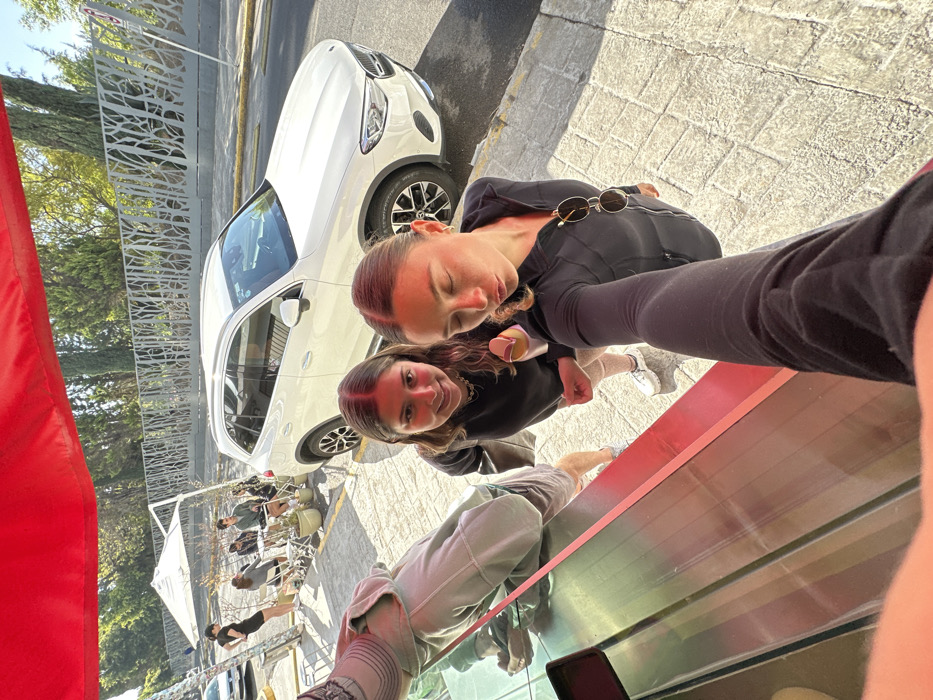 This image depicts an outdoor urban street scene in Puebla City, Mexico, under bright daylight. In the immediate foreground, a person's arm, clad in a black long-sleeved top with sunglasses hanging from the neckline, extends into the lower right frame, capturing a selfie. This person's face is partially visible, eyes closed, with lips pursed. Standing adjacent is a second female, smiling directly at the camera, wearing a dark long-sleeved shirt and light-colored shorts, holding a small, light-colored object in her right hand. To their left, a third individual, partially visible in a light-colored hoodie and shorts, stands behind a reflective metallic counter, suggesting a vendor or service person. A red awning partially covers the top of the frame. In the midground, a white Mercedes-Benz SUV is parked parallel to the curb on a paved street. Beyond the vehicle, an outdoor cafe seating area is visible on a sidewalk, furnished with several white tables and chairs beneath a large white umbrella. Approximately 5-6 individuals are present in this area, some seated, others standing, appearing to be patrons. One female in a black dress stands near a table. Potted plants are distributed around the seating area. The background features a distinctive, decorative metal fence with an organic, branch-like pattern, separating the street from an area densely populated with tall green trees. The ground in the foreground consists of light-colored cobblestones or pavers, while the street is asphalt. The sky is clear blue.