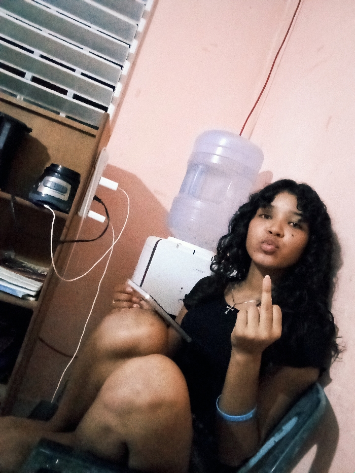 An indoor scene in Juan Griego, Venezuela, depicts a young adult female seated. She has dark, curly hair and is wearing a black top with a silver-colored cross necklace and a light blue bracelet on her left wrist. Her bare legs are crossed. The female's lips are pursed, and her right hand is raised with the middle finger extended. A white, pen-like object is held in her left hand, resting on her lap. The background features a light pink wall. To the viewer's left, a wooden shelf unit holds a black blender and a stack of printed materials. Above the shelves are white horizontal window blinds. A white electrical outlet on the wall has two white chargers connected by white cables; one cable leads to the blender. A separate red wire hangs vertically on the wall. A white desktop water dispenser with a large, clear plastic water bottle is visible, featuring "CONAIR" branding. The subject is seated on a dark-colored chair, partially visible in the lower right.