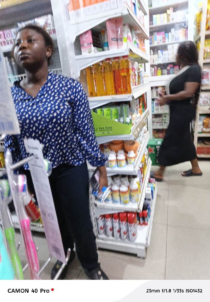A woman in a blue and white patterned shirt and black pants stands near a shelf filled with various products in a store. She holds a small blue item in her hand. Another woman in a black dress walks away in the background. Shelves are stocked with toiletries, medications, and other household items. Toothbrushes are visible in the foreground, with the store's aisle stretching into the distance.