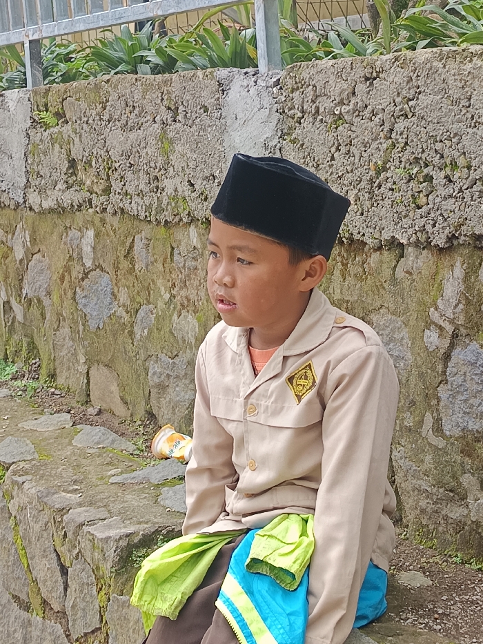 A young boy in a tan uniform and black peci hat sits on a stone wall. He looks to the side with a thoughtful expression. A colorful cloth is draped over his lap. A discarded juice box lies on the stone to his left. The wall is made of grey stones and is covered in moss. Green plants grow behind the wall, and a fence is visible in the background. The scene is captured in natural light, creating a candid and somewhat melancholic mood.