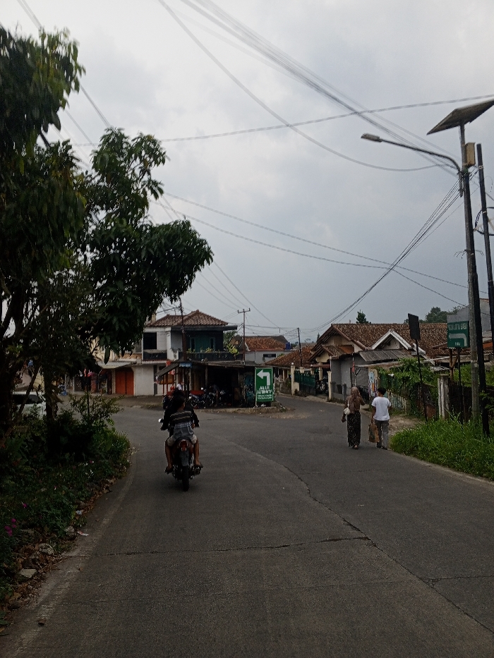 This image depicts a street scene under an overcast, gray sky. The location is identified as being in the city of Kheda, India. In the foreground, a paved asphalt road, exhibiting minor cracks, curves gently to the right. A person, wearing a striped shirt, is operating a dark-colored motorcycle or scooter, traveling away from the viewer on the left side of the road. Further down the road, two pedestrians are walking away from the viewer on the right side. The pedestrian closer to the right edge of the road wears a white t-shirt and light-colored pants, carrying an object in their left hand. Adjacent to them, another pedestrian wears a patterned head covering and a patterned garment, also carrying an item in their left hand. On the left side of the road, large green trees partially obscure multi-story buildings with light-colored facades and reddish-brown tiled roofs. Below the trees, a green directional sign with a white left-pointing arrow is prominently displayed, indicating "JALAN UTAMA" and "MALANG." Several other motorcycles are parked near a covered structure behind this sign. Along the right side of the road, residential buildings with reddish-brown tiled roofs are visible, interspersed with green vegetation and low fences. A tall utility pole equipped with a solar panel and a street light fixture stands on the far right, supporting a network of overhead utility wires that crisscross the sky. A second green sign, partially obscured, is also visible on the far right.