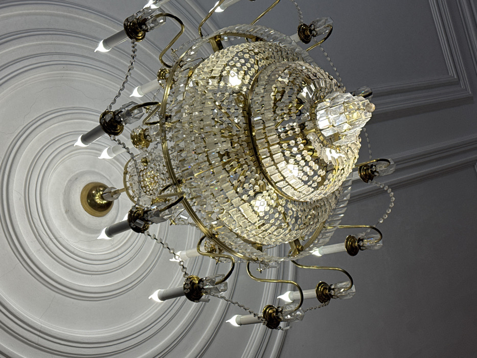 - "An illuminated, multi-tiered crystal chandelier is depicted from an upward-angle perspective, suspended from a white ceiling in the city of Mahilyow, Belarus" by FM-zJF163, licensed under CC BY 4.0