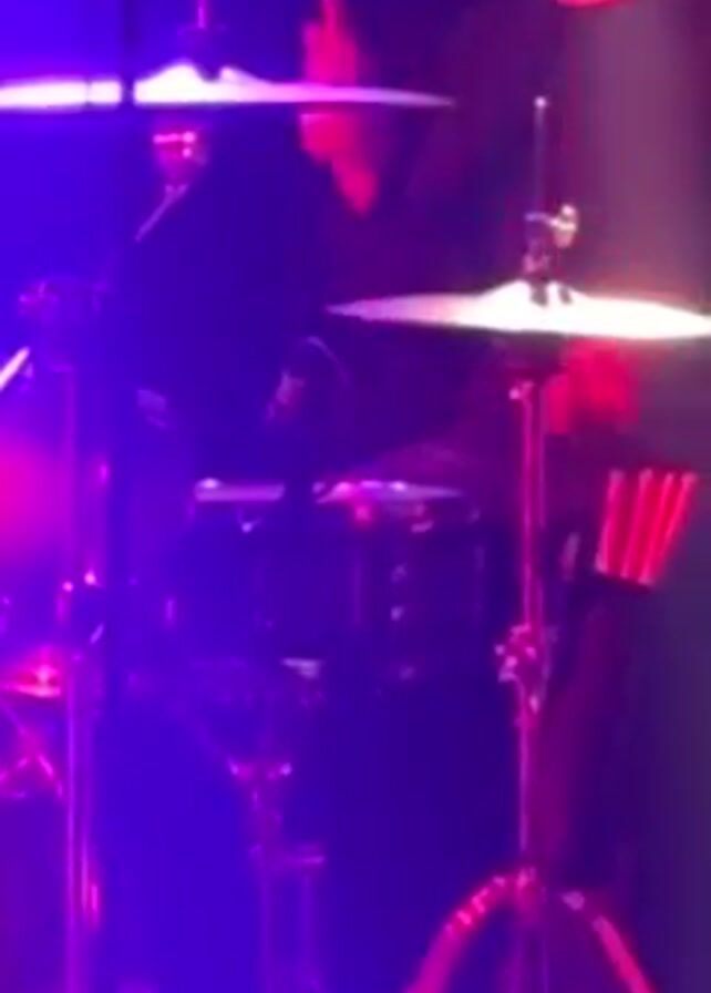 drummer playing a drum kit on a stage bathed in blue and pink light. The drummer is wearing black and obscured by shadows. Cymbals and the snare drum are visible, along with some drum sticks.