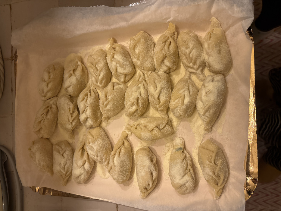 - "A tray lined with parchment paper holds approximately twenty-one uncooked dumplings" by FM-2VH5m1, licensed under CC BY 4.0
