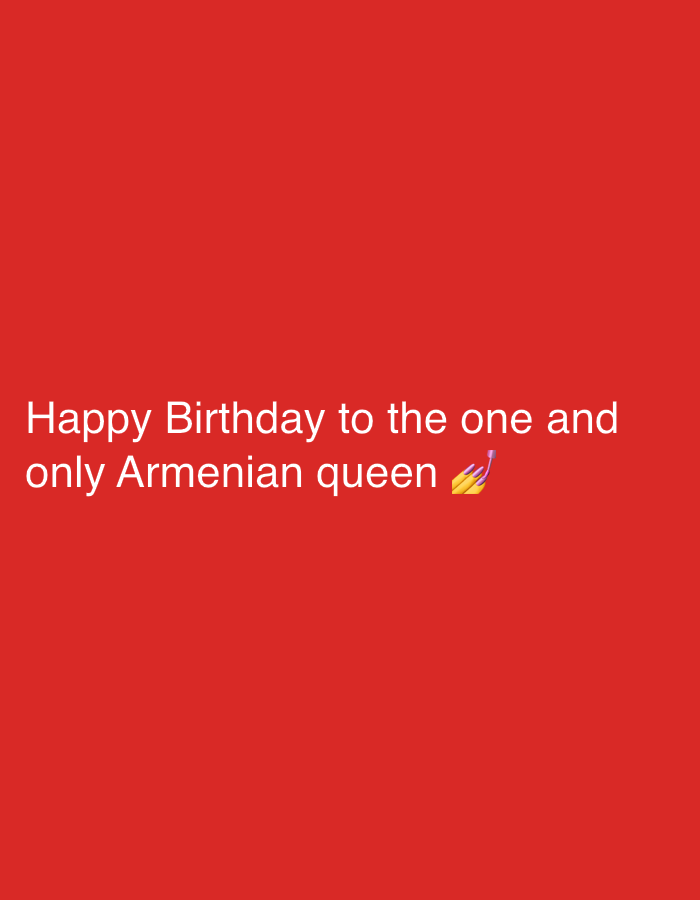 The image displays a solid red background. White sans-serif text is centered horizontally towards the bottom of the frame, reading: "Happy Birthday to the one and only Armenian queen". To the right of the word "queen", a colorful emoji depicting a party popper with streamers is present. There are no other visible subjects, objects, people, actions, interactions, or environmental details. The image contains no visual information indicating a specific location in the city of Sofia, Bulgaria, or any other geographical place.