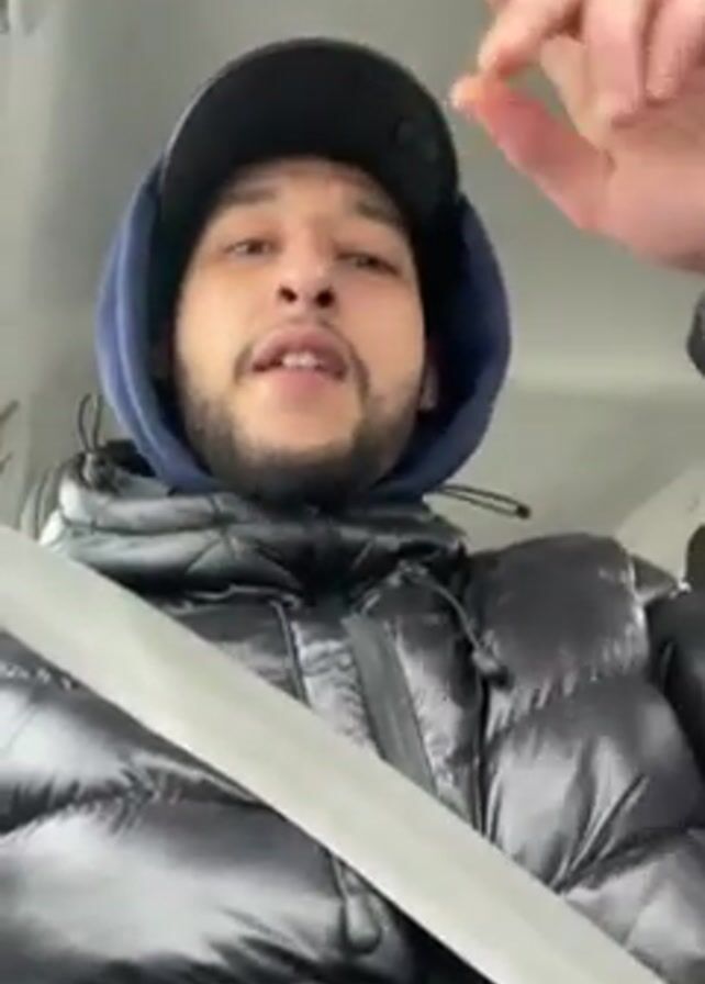 A man in a car, wearing a black puffy jacket with a blue hoodie underneath and a black baseball cap, gestures to the camera while listening to music. He is wearing a seatbelt. The car's interior is visible in the background.
