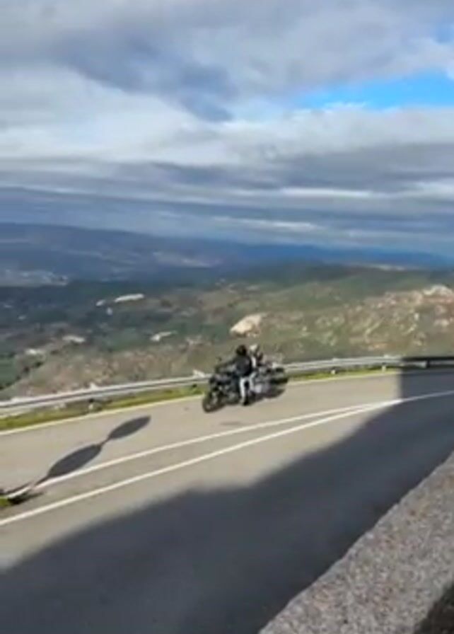 scenic mountain road. Initially, a motorcycle with two riders passes along the road, traveling to the right. The road has a guardrail on the side closest to the mountain drop-off. The background is a mountainous landscape with a cloudy sky above. The motorcycle passes, then the view focuses on the scenery for a brief moment before a second motorcycle, this time with a single rider, passes in the same direction. The camera is stationary, positioned behind a low concrete wall.