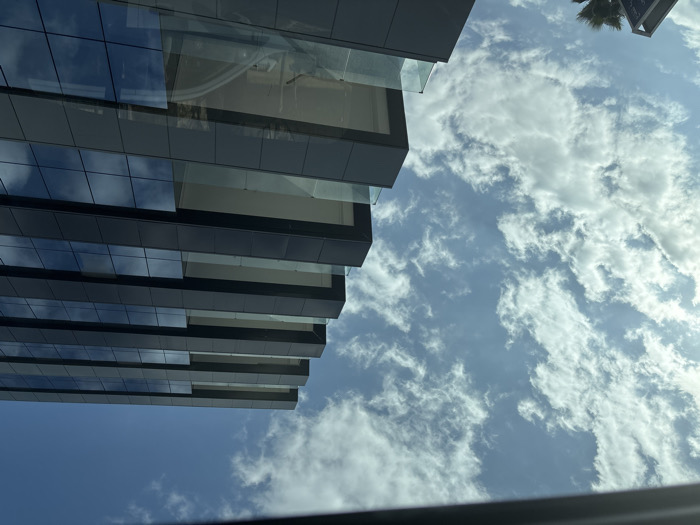 The image presents a low-angle, upward view of a modern, multi-story building located in the city of Fez, Morocco. The building features a contemporary architectural design with a dark, likely anthracite or black, paneled facade contrasted by large, reflective, blue-tinted glass windows. Several balconies with clear glass balustrades protrude from the structure, creating a layered effect on the visible corner. The glass windows reflect the cloudy sky and a partial, distorted image of a white vehicle. The sky occupies the upper-left portion of the frame, displaying a bright blue expanse populated by numerous scattered white cumulus clouds. A section of a palm tree's fronds is visible in the lower-left background. The top edge of the frame reveals the interior structure of a vehicle, suggesting the photograph was captured from within a car looking upwards. No individuals or specific actions are discernible in the scene.