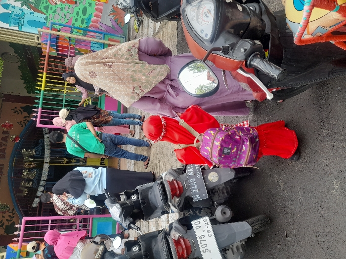 A group of people stand near a colorful building. Two motorbikes are parked nearby with license plates visible. One person wears a green shirt, while others are in varied attire including a hijab. A red dress and a purple bag are placed on one of the motorbikes. The scene is likely a drop-off or pick-up at a school or childcare facility.