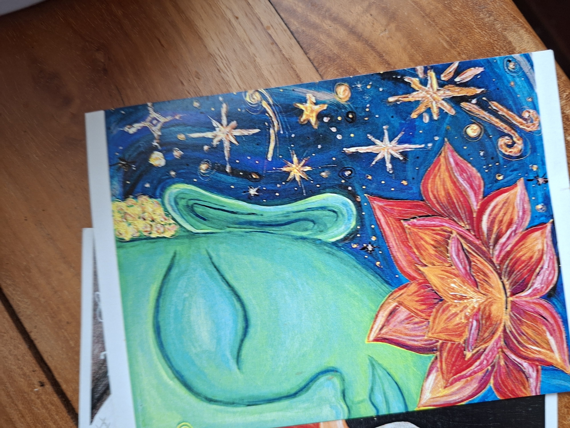 A close-up shot depicts a colorful drawing on a piece of paper placed on a wooden surface. The drawing features a bright blue background filled with stars and swirling patterns. In the foreground, there is a large, stylized flower in shades of red, orange, and yellow. To the left of the flower, there is a large, amorphous green shape with yellow accents. The piece of paper is part of a stack, with glimpses of other drawings visible underneath. The scene's location is not specified within the image, but the city is Lodtunduh, Indonesia.