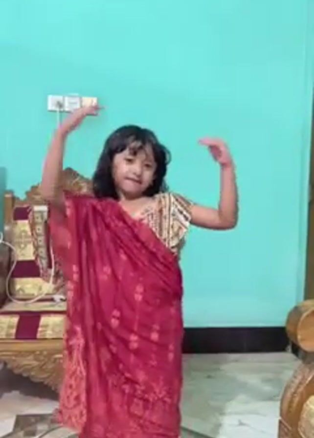 A young girl is dancing in a room. She is wearing a maroon and gold outfit with a draped maroon cloth. The room has light blue walls, a patterned tile floor, a decorative wooden chair, and a wooden table. She is smiling and moving her arms. Electrical outlets are visible on the wall behind her.