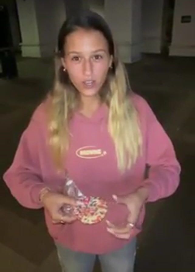 A young woman stands outside on a sidewalk. She is wearing a pink hooded sweatshirt and light gray jeans. She holds a cookie in a plastic bag, and smiles at the camera. The area is lit by streetlights. There is a building with white pillars behind her. The ground is made of rectangular pavers.