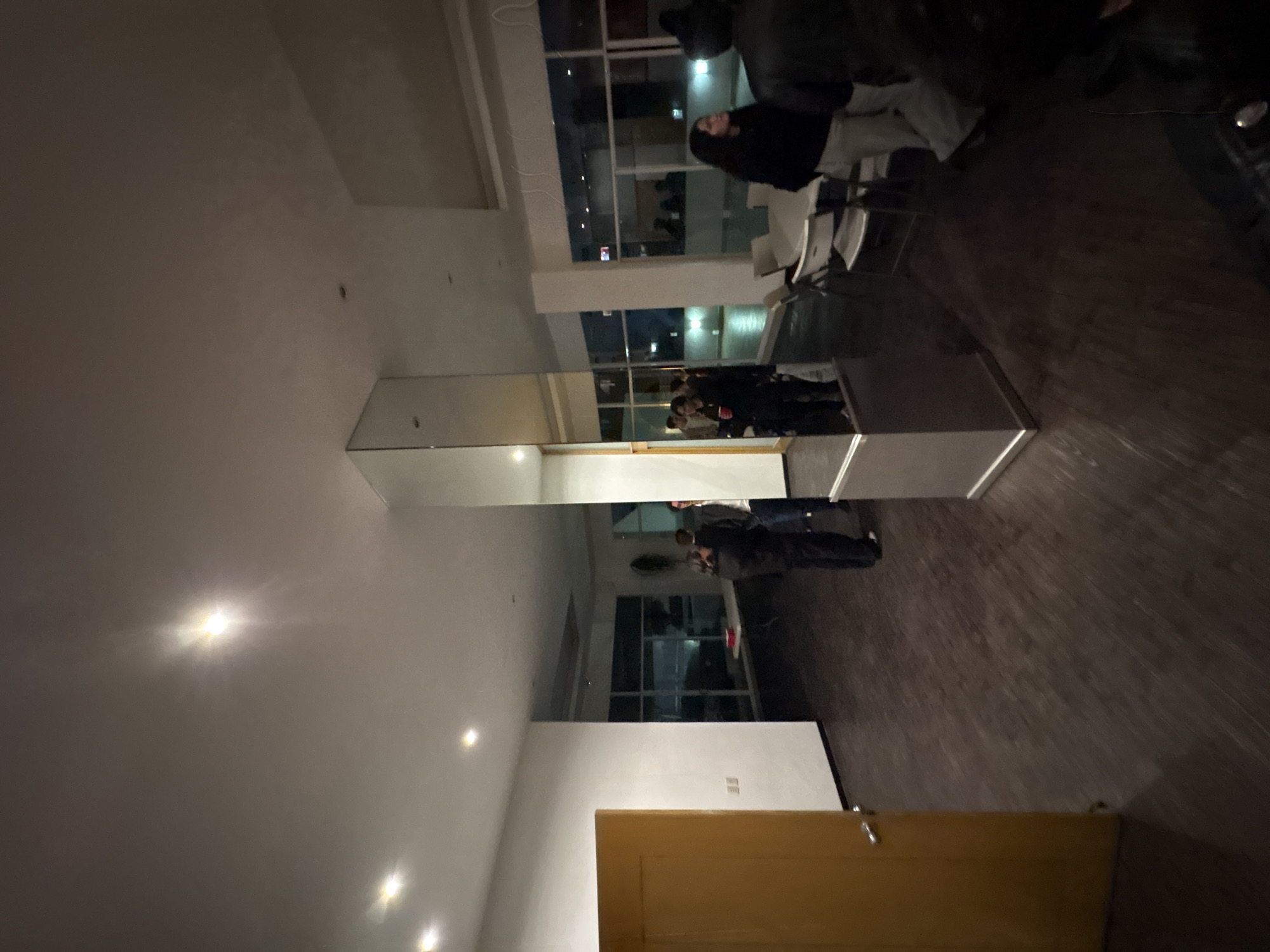 The image depicts an interior space, possibly in Jesús del Monte, Mexico. The scene features a mirror reflecting a gathering of people in a modern building with large windows. Seating is visible, along with hardwood flooring. A closed wooden door is also present in the lower portion of the frame.