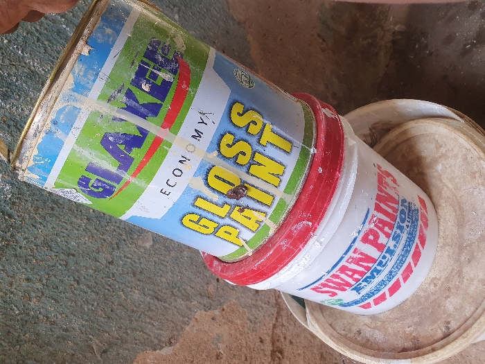 The scene depicts three paint containers stacked vertically against a textured wall in Unknown, Unknown. At the top, a blue, green, and white metal paint can, labeled "GLAKE ECONOMY GLOSS PAINT," is visible, showing signs of wear, dents, and paint splatters. A small, dark, possibly rusted or dried paint spot is present on the label. The top edge of the can is slightly deformed, appearing partially pried open. A finger, possibly of an individual holding or interacting with the can, is visible at the far right edge of the frame. This can rests upon a white plastic bucket with a red rim, labeled "SWAN PAINTS EMULSION," which also exhibits paint residue. This middle bucket, in turn, sits on a lighter-colored, circular plastic lid or base, likely from another bucket, which is partially visible at the bottom. The background consists of a textured, mottled wall with greenish-blue and reddish-brown hues to the left and upper portions, and a darker, indistinct surface, possibly a floor, to the lower right.