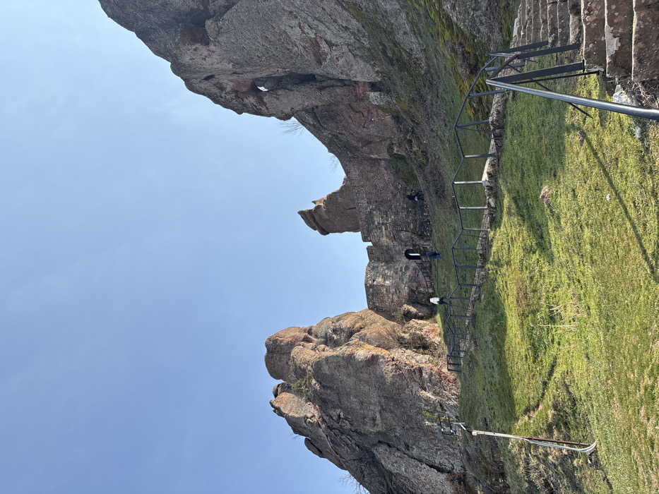 The image displays a wide, upward-angled view of the Belogradchik Fortress in Belogradchik, Bulgaria, under a clear, light blue sky. Massive, reddish-brown rock formations, characteristic of the Belogradchik Rocks, frame the scene, with distinct peaks on the left and a large rock formation on the right featuring a natural, arch-like opening. Sections of the stone fortress walls, built from dark grey and reddish-brown masonry, are integrated with these natural rock structures. A prominent stone archway, appearing as an entrance, is centrally located within a fortified wall section. In the foreground and midground, a vibrant green grassy slope ascends towards the fortress. A series of stone steps, fitted with black metal handrails, facilitates access up the incline. Four individuals are observed traversing this path: one person in a white top is walking uphill on the left side of the path, while three other individuals, clad in darker clothing, are further up the slope, approaching the fortress entrance. The scene is brightly illuminated by direct sunlight, casting shadows to the left, indicating a clear, sunny day. A vertical white pole with attached cables is partially visible in the lower-left corner of the foreground. Sparse vegetation and moss are present on the rocks and ground.