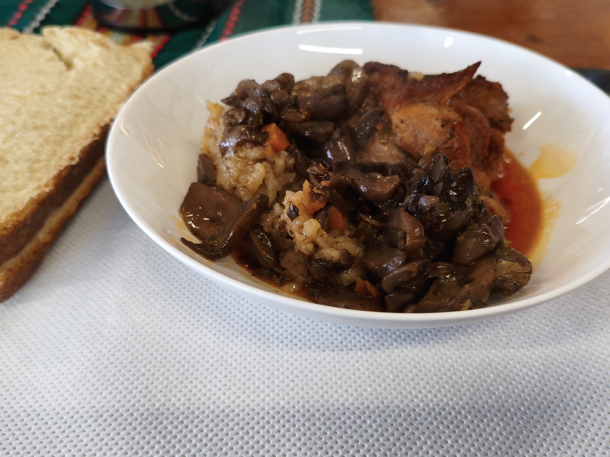 A white plate of food sits on a white, textured placemat. The plate contains a portion of rice, a piece of cooked meat, and a topping of sauteed mushrooms. A slice of bread is positioned to the left of the plate. The image appears to have been taken in a casual dining setting, possibly in Tervel, Bulgaria. A blurry patterned cloth is visible in the background.
