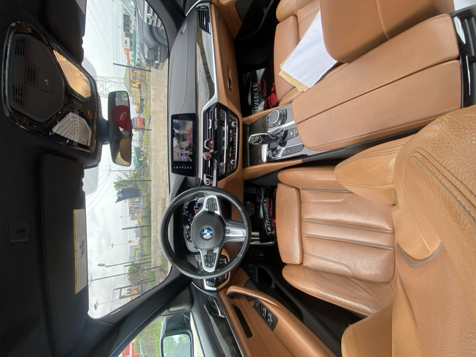 The image depicts the interior of a BMW vehicle's front cabin, viewed from a forward-facing perspective