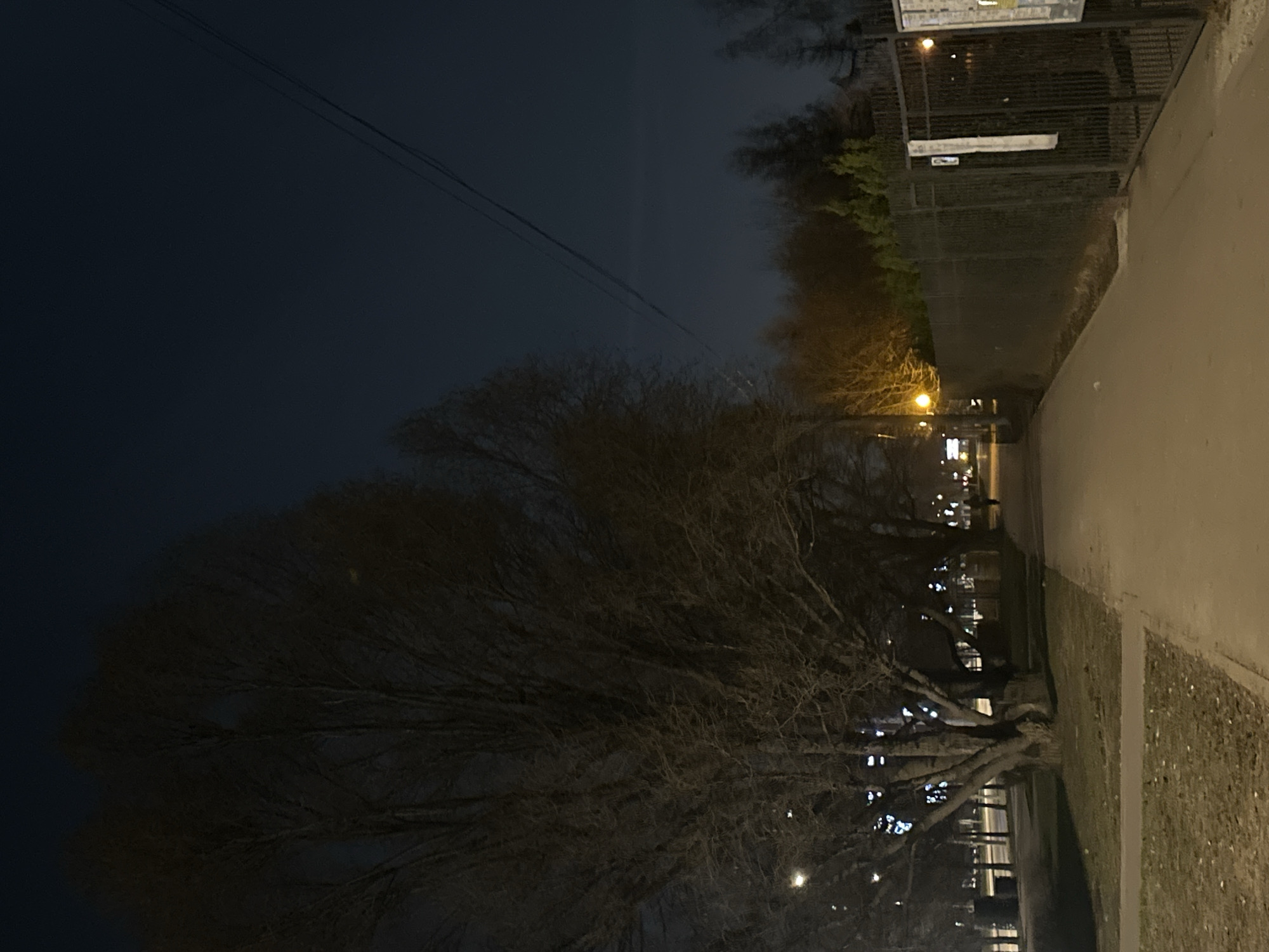 The image depicts a night scene, likely in Moscow, Russia, given the context. A large, leafless tree dominates the left side of the frame, with its branches silhouetted against the dark sky. A sidewalk runs along the right edge of the image, next to a strip of grassy area. Fencing lines the sidewalk. Streetlights illuminate the path and the buildings in the background, creating a blurred effect. No people are discernible in the image. Overhead wires stretch across the upper part of the image.