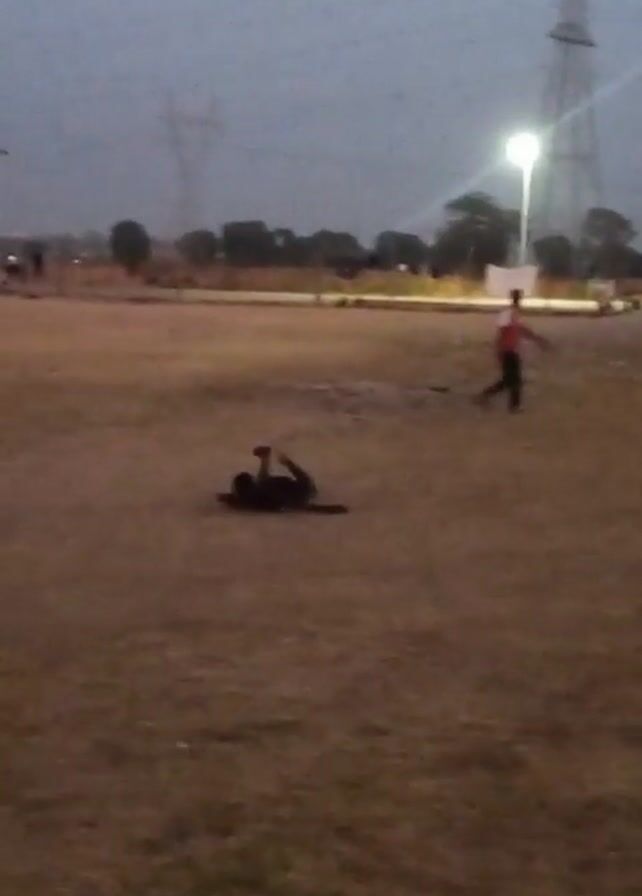 field at dusk. A figure in dark clothing is seen doing a breakdancing move, possibly a headstand, on the ground. Another person, wearing a red shirt, is standing and watching. People are gathered in the background and appear to be cheering. A tall transmission tower and a streetlight are visible in the background, and other trees are scattered throughout. The camera is shaky, and the focus shifts throughout the video.