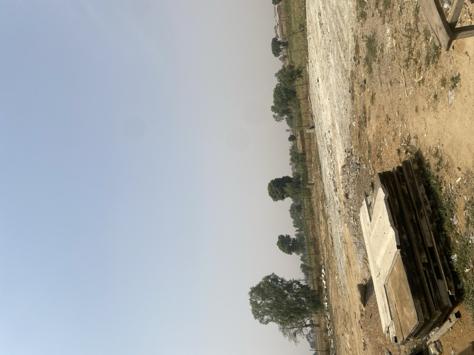 The image displays an outdoor, undeveloped site in Gyellesu, Nigeria, under a pale blue, hazy sky