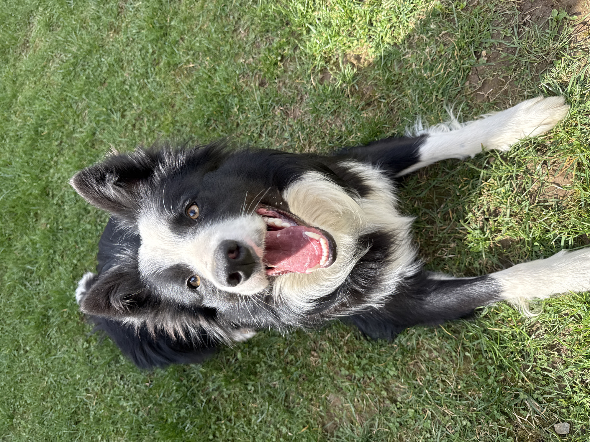 A black and white Border Collie dog is depicted lying down on a patch of green grass in Berkovitsa, Bulgaria, viewed from a high angle. The dog is positioned centrally, facing upwards towards the camera with its mouth wide open, revealing its pink tongue and white teeth in a panting or smiling expression. Its eyes, brown in color, are open and directed upwards. The fur is predominantly black on the body and head, with distinct white markings on the chest, muzzle, a stripe running between the eyes, and on all four paws, which are extended forward. The ears are erect and pointed. The grass beneath the dog is bright green, indicating strong daylight conditions with subtle shadows present, suggesting outdoor illumination. No other subjects or objects are visible.