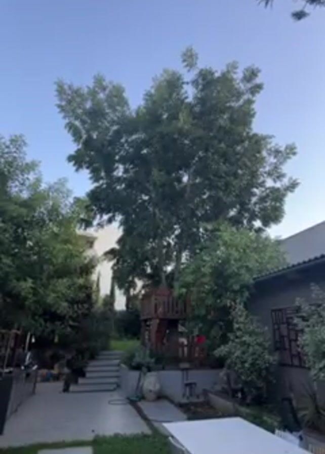 backyard with a large tree house nestled in the middle of a big leafy tree. The yard is well-maintained with a combination of grass, stone slabs, and concrete. There are several trees and shrubs around the yard, providing shade. A white rectangular table and chairs sit in the foreground. A set of stairs leads up to a higher level of the yard, and a modern house is visible in the background. The sky is a clear blue. There are no people present in the shot.