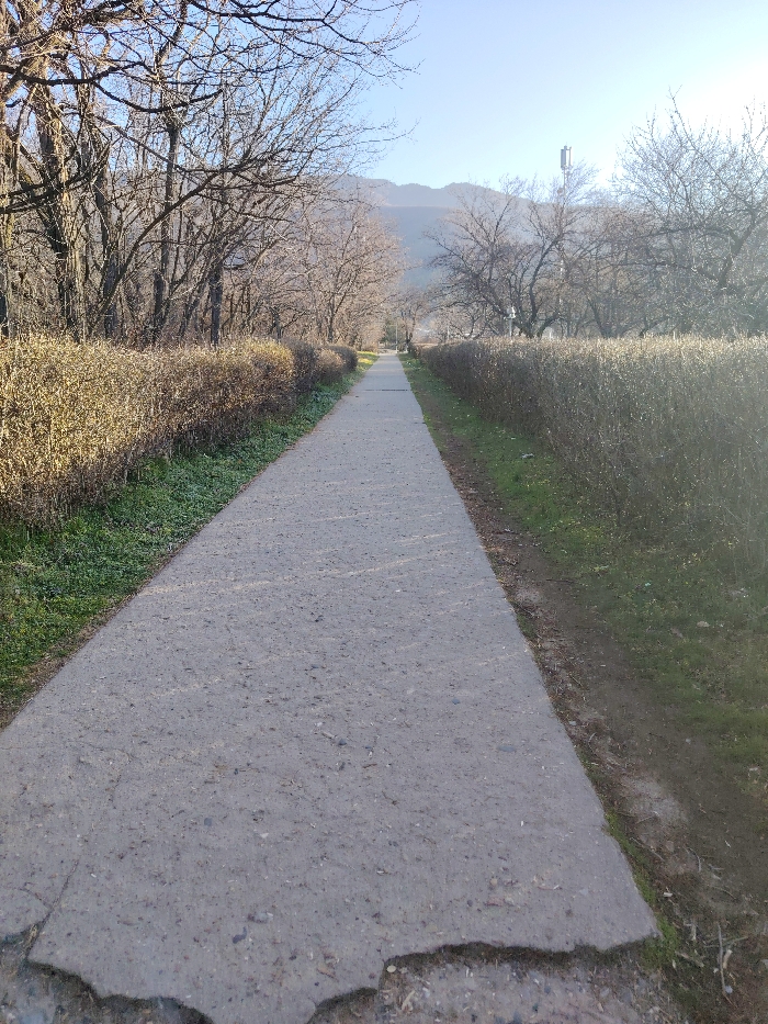 An outdoor pathway, located in Karnare, Bulgaria, is depicted under clear daytime conditions. A straight, gray concrete or asphalt path extends from the foreground towards the background, receding in perspective. The path surface exhibits wear and minor cracking, particularly visible in the immediate foreground. Dense, brown-toned hedges line both sides of the pathway, with a narrow strip of green groundcover or grass bordering the path before the hedges. Beyond the hedges, numerous bare deciduous trees with visible branches are present on both the left and right sides of the scene. In the distant background, a mountain range is visible beneath a light blue sky. A tall, slender cellular tower or antenna structure stands on the right side of the background, partially obscured by trees. No individuals, animals, or specific actions are observed within the frame.