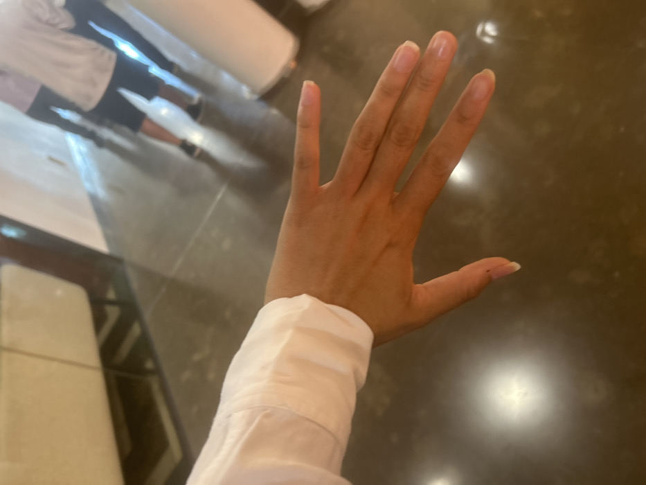 A light-skinned right hand and forearm, partially covered by a white long-sleeved garment, are prominently displayed across a dark, highly reflective polished floor surface